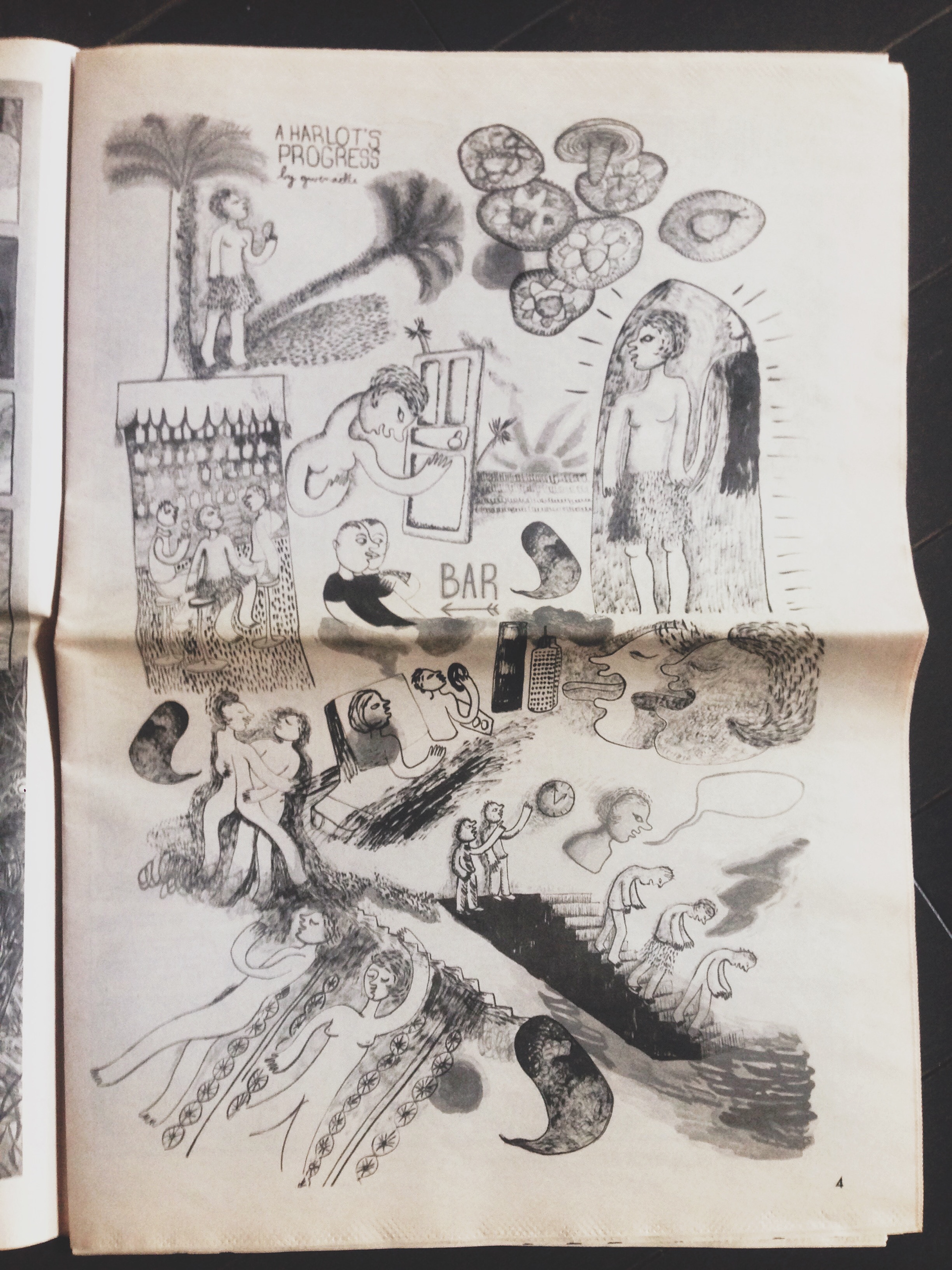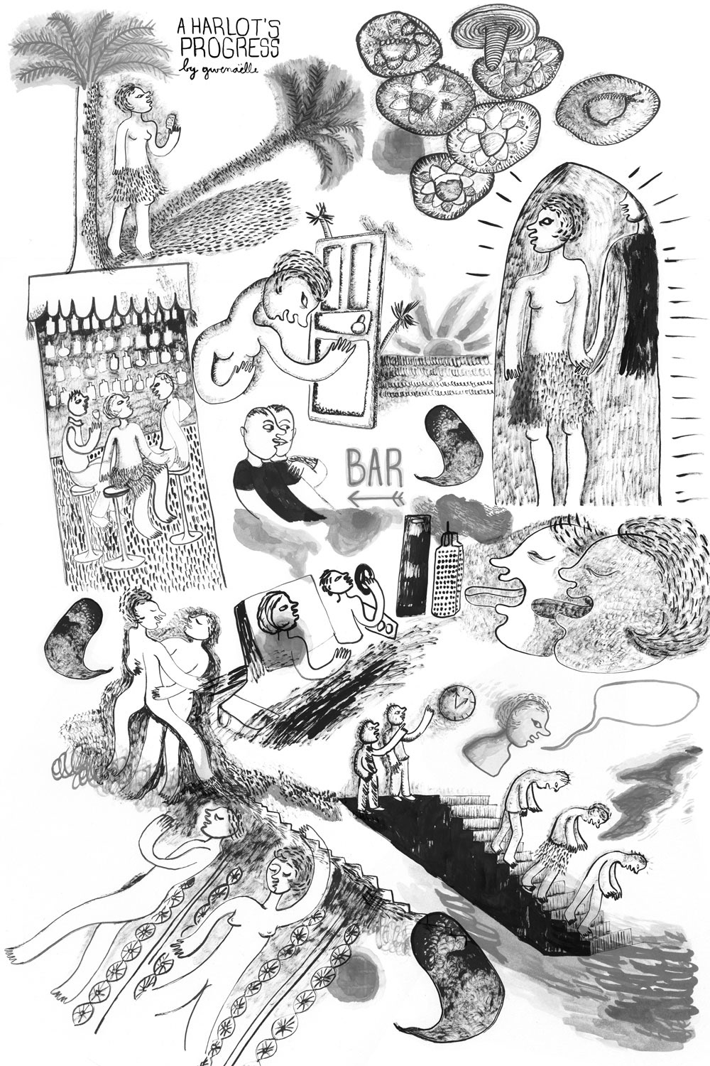 Published in Smoke Signal #3 by Desert Island and part of the 3x3 International Illustration Show. 'A Harlot's Progress' is an homage to David Hockney's A Rake's life, which is an homage to Hogarth's series of the same name.